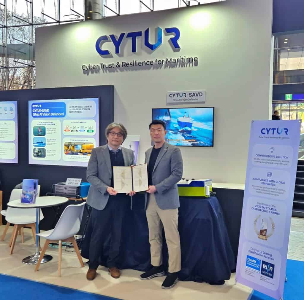 [테크월드뉴스=박규찬 기자] 싸이터는 ‘2025 ACDC(AI Cyber Defense Contest)’에서 AI 기반 선박 영상감시 위협 대응 솔루션 ‘CYTUR-SAVD(SAVD: Ship AI Vision Defenser)’를 공개하고 이탈리아 선급(RINA)으로부터 선박 사이버 보안 AIP(Approval In Principle)를 획득했다고 3일 밝혔다.